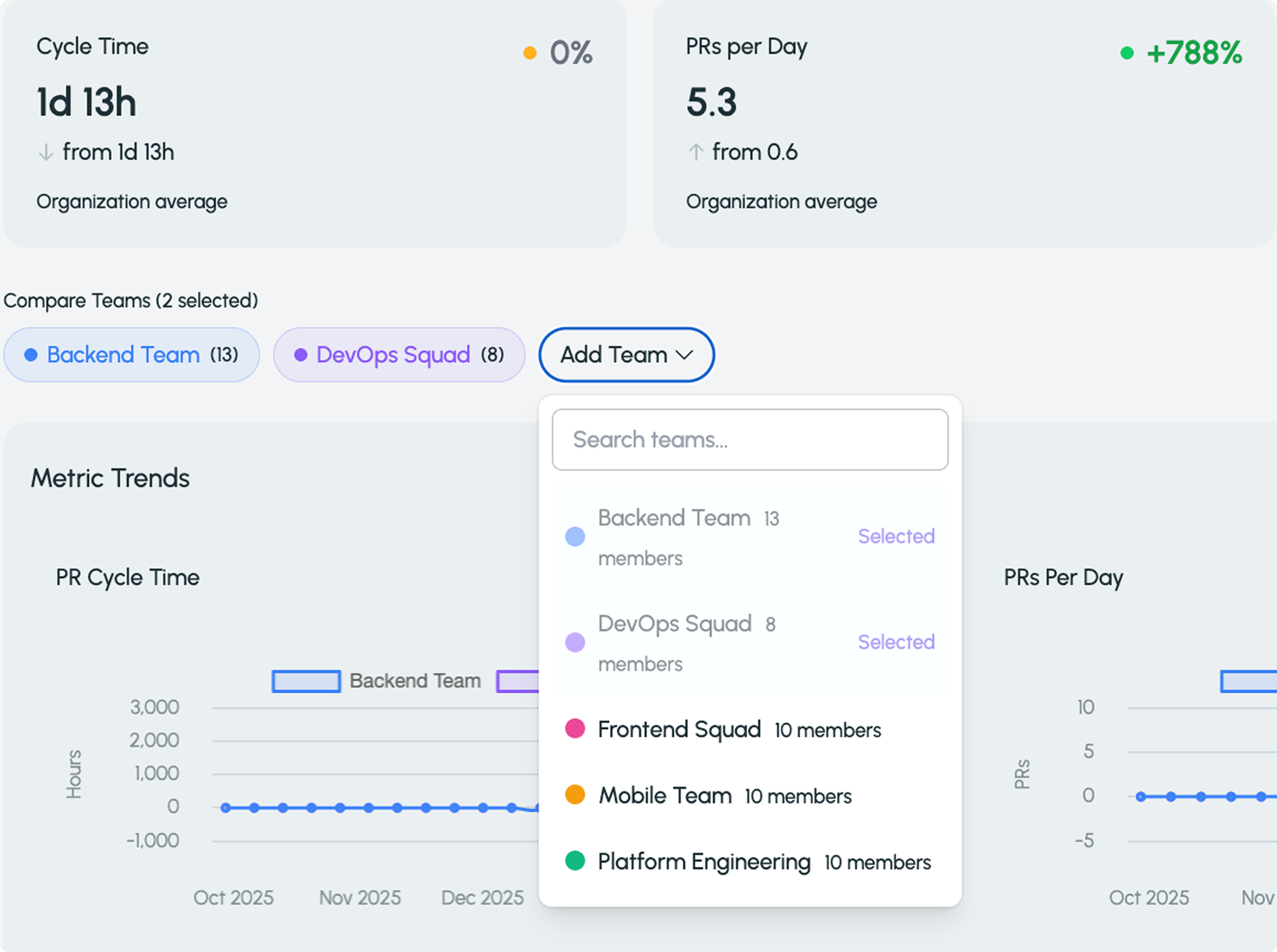 Analyze performance across teams using delivery, workflow, and developer experience metrics in one clear comparison view.